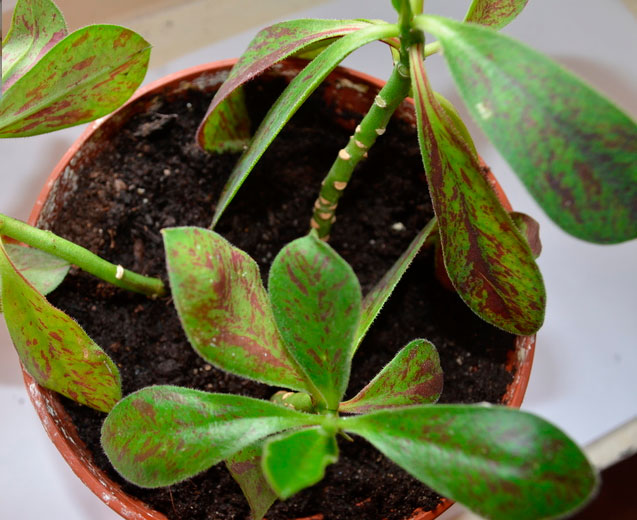 w zimie synadenium potrzebuje chłodu. Ale jednocześnie warto wziąć pod uwagę, że w pokoju nie powinno być mniej niż 10 stopni. W przeciwnym razie kwiat może zrzucić całe liście.