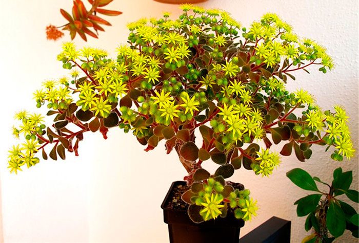Aichrison (Aichryson) więcej " drzewo miłości ». Ma bezpośredni związek z rodzajem soczystych roślin, które są częścią rodziny grubych. Taka roślina woli rosnąć w pęknięciach skał. W naturze można go spotkać na Wyspach Kanaryjskich i Azorach, Maderze, Portugalii i Maroku. Ten rodzaj łączy 15 gatunków, wśród których są byliny zielne i jednoroczne oraz krzewy. NAZWA takiego kwiatu pochodzi od 2 greckich słów, a mianowicie: AI - "zawsze" i chrysos - "złoty". Aichrison ma wyraźne podobieństwo do blisko spokrewnionego drzewa pieniędzy.