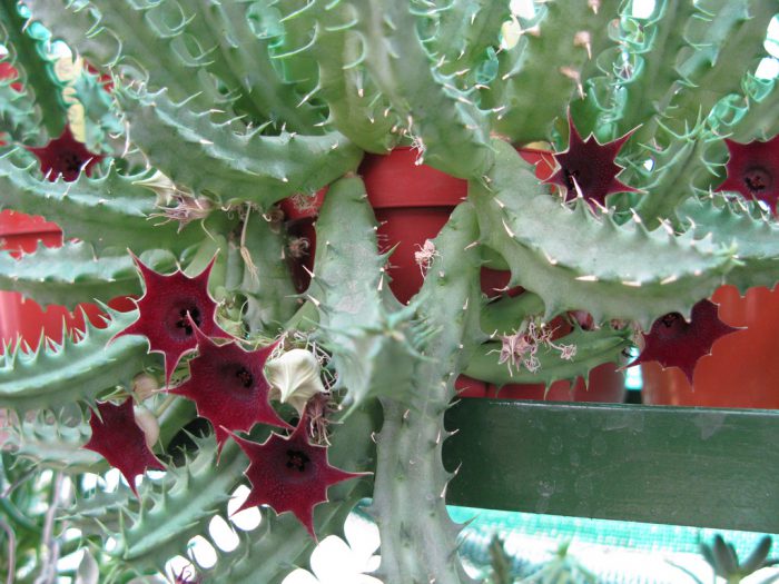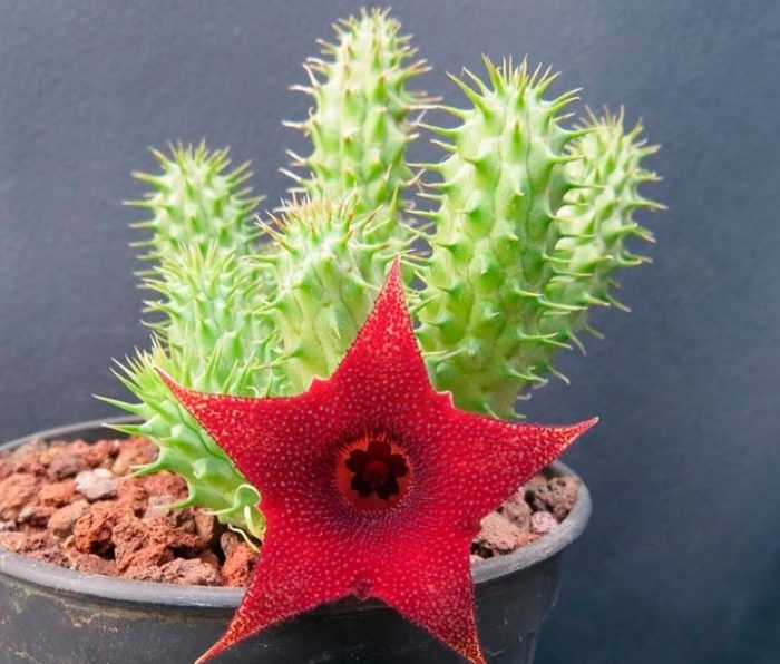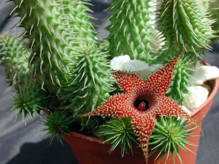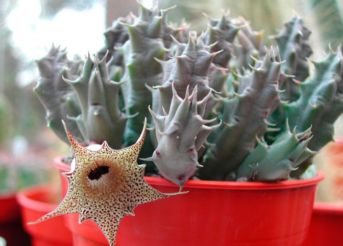 kwiaty są podobne do rozgwiazdy, ale tylko odwrócone otworem gębowym do góry, a duża liczba dość długich brodawek na działkach zwiększa takie podobieństwo. Kwiaty mogą być malowane w różnych kolorach, na przykład w Kolorze Żółtym, brązowo-czerwonym, w innych czerwonawych naroślach na żółtej powierzchni lub odwrotnie. Wielkość korony może wynosić od 2,5 do 5 centymetrów.