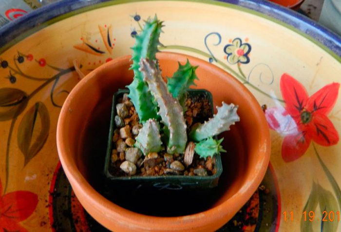 jest również bardzo interesujący. Ze względu na łodygi ten sukulent jest podobny do kaktusa, pomalowanego na nasycony zielony kolor i mającego miękkie grube igły, które stają się czerwone od światła słonecznego. Średnica pędów wynosi 1,2-2 centymetrów, a ich długość wynosi 20 centymetrów. Na łodygach z reguły znajduje się od 9 do 16 żeber (jest ich więcej), dzięki czemu ząbki są bardzo ciasne (prawie blisko siebie). Zęby u podstawy są stożkowate, podczas gdy silnie zwężają się prawie na samej powierzchni i pozostawiają cienkie pół centymetrowe ogony, dzięki czemu krzak wygląda puszysto.