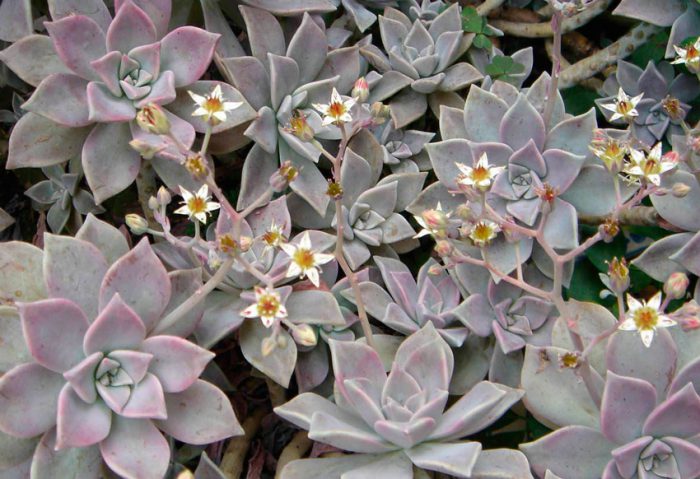 Graptopetalum (Graptopetalum) albo plamistość - ten rodzaj jest bezpośrednio związany z rodziną Crassulaceae (Crassulaceae). Skupia około 20 gatunków roślin reprezentowanych przez Sukulenty. W warunkach naturalnych można je spotkać na suchych obszarach kontynentu amerykańskiego, od Arizony (USA) po Meksyk.