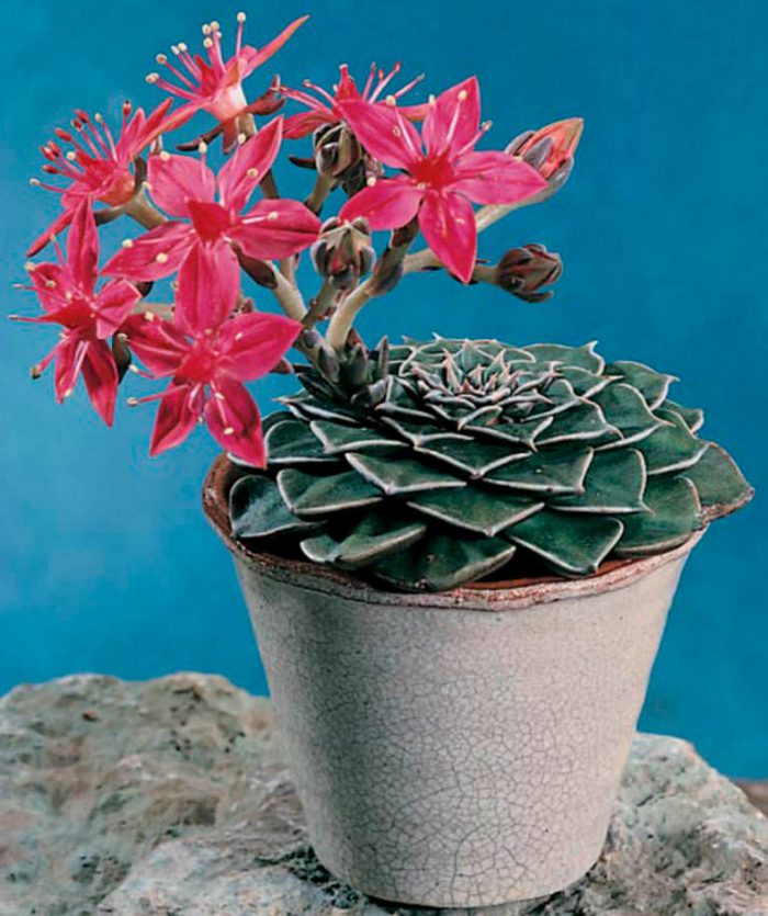 lub kamienna róża - ma soczystą nagą krótką łodygę, podczas gdy u młodych okazów jest wyprostowana,a u dorosłych-leżąca. Rozety składające się z liści są dość luźne i nie tak liściaste jak piękne graptopetalum. Mięsiste liście w kształcie jajnika są spiczaste na końcu. Osiągają długość 5-8 centymetrów, szerokość 1,5-4 centymetrów, a grubość około 1 centymetra. Na ich powierzchni znajduje się niezbyt duża powłoka woskowa, dzięki której liście mają niebieskawo-niebieski kolor. I są odmiany o wyraźnym różowawym odcieniu.