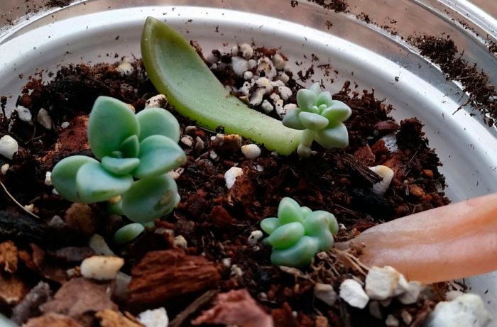 przed posadzeniem sadzonek liści należy je wysuszyć przez 24-48 godzin. Następnie ich ogonek jest zakopany w mieszance ziemi. Takich sadzonek nie należy mocno zwilżać ani przykrywać szkłem lub folią, ponieważ gnicie może pojawić się na nich bardzo szybko. Jeśli stworzysz optymalne warunki, ukorzenienie nastąpi po 7 dniach, a po 6-8 tygodniach rozpocznie się formowanie młodej rośliny.