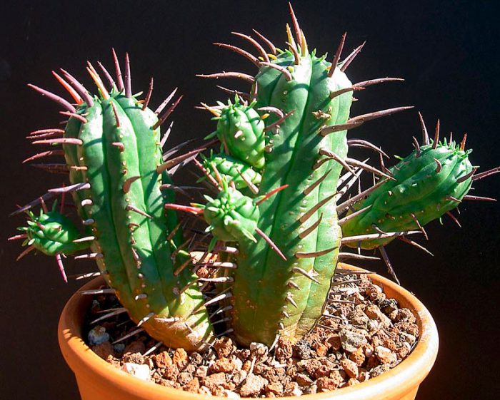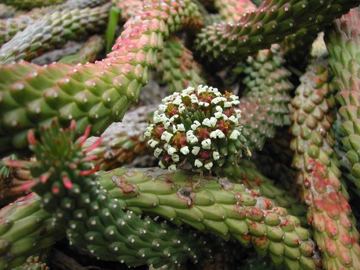 również pochodzi z Południowej Afryki. Wygląda bardzo podobnie do kaktusa. Ten soczysty u podstawy jest bardzo rozgałęziony, a jego wysokość waha się od 30 do 100 centymetrów. Cylindryczne pędy o nasyconym zielonym kolorze mają od 6 do 8 ostrych krawędzi i średnicę równą 3 centymetrom. Na szczytach żeber znajduje się ogromna liczba twardych, grubych czerwonawo-brązowych kolców o stożkowym kształcie, których długość waha się od 1 do 6 centymetrów. Na szczycie pędu powstaje kwiatostan. Młode szypułki wyglądają bardzo podobnie do kolców znajdujących się w pobliżu, ale z czasem ich wierzchołek otwiera się na małą (średnica 5 milimetrów) filiżankę przylistków o ciemnoczerwonym kolorze.