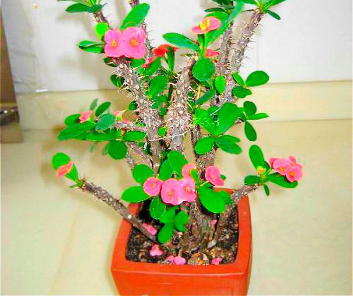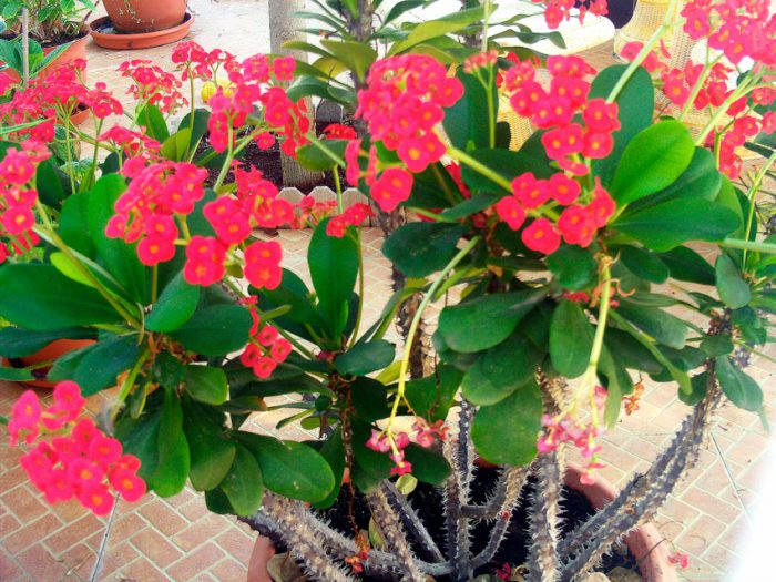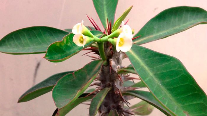 który jest również nazywany mleczem pięknym lub błyszczącym ― Euphorbia splendens) - wyspa Madagaskar jest miejscem narodzin tego soczystego, silnie rosnącego krzewu. W naturze taki wilczomlecz może dorastać do 200 centymetrów wysokości. Powierzchnia łodygi jest guzowata i ma dobrze widoczny szarawy odcień. Znajduje się na nim ogromna liczba igieł grubych stożkowych kolców, które mogą osiągnąć długość 3 centymetrów. Krótkie liście mają kształt eliptyczny lub odwrotnie jajowaty, a szerokość osiąga 15 centymetrów i długość-3,5 centymetra. Z czasem dolne liście umierają i pozostają tylko na szczycie łodygi. Kształt przylistków jest podobny do tego, który ma poprzedni wygląd, ale mają większą średnicę zgięcia, która wynosi 12 milimetrów. Ich kolor może być inny, na przykład nasycony-szkarłatny, Biały, pomarańczowy, żółty lub różowy.
