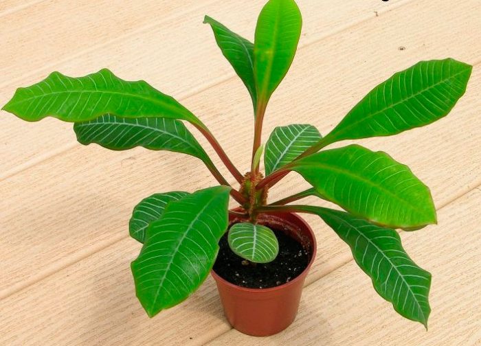 ojczyzną tego soczystego krzewu jest Meksyk. Zarówno zewnętrznie, jak i pod względem wielkości krzewu, gatunek ten jest podobny do mleczka białożyłkowego. Ale w takiej roślinie, chociaż żyły na płytce liściowej są dobrze rozpoznawalne, ale mają zielony kolor. A istniejące wzrosty na żebrach łodygi są bardziej podobne do płaskiego kolczastego grzebienia. Kolor przylistków jest białawo-różowy.
