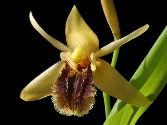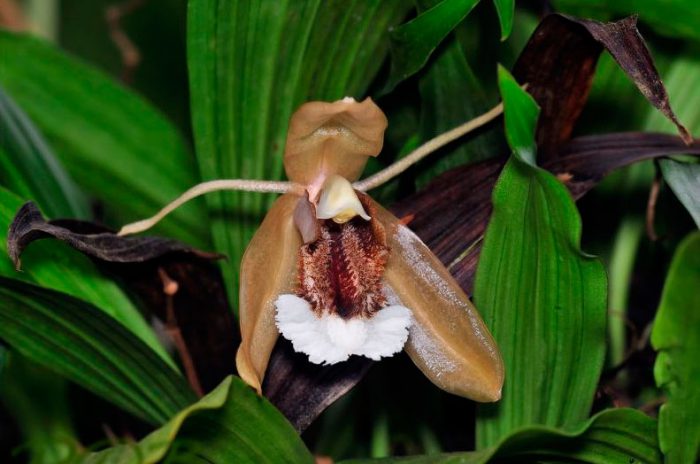 w naturze można go znaleźć tylko wysoko w Himalajach, podczas gdy rośnie prawie przy samej granicy śniegu. Ta roślina jest kochająca zimno i ma pseudobulwy o kulistym wydłużonym kształcie, które osiągają długość od 3 do 5 centymetrów i 2 długie liście. Na szypułkach umieszcza się od 3 do 8 sztuk białych kwiatów i dość dużych rozmiarów (Średnica do 10 centymetrów). Te kwiaty różnią się kształtem wargi. Jest więc trójłopatowy i ma 5 dobrze rozpoznawalnych "przegrzebków"-wzrostów. Kwitnienie obserwuje się od zimy do początku wiosny.