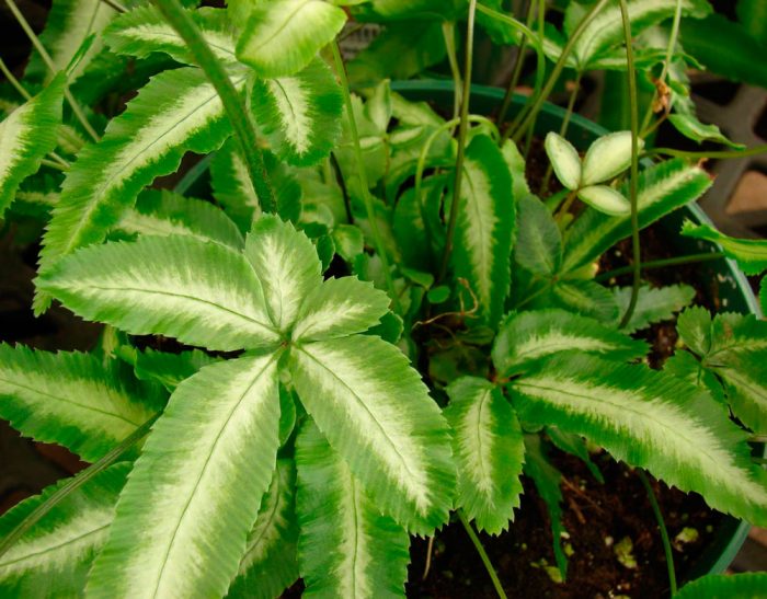 roślina ma wiele bardzo wąskich ciemnozielonych liści. Długość ogonka wynosi około 30 cm na jego końcu znajduje się pięć wąskich lancetowatych liści o długości do 45 cm odmiany do uprawy w pomieszczeniach: