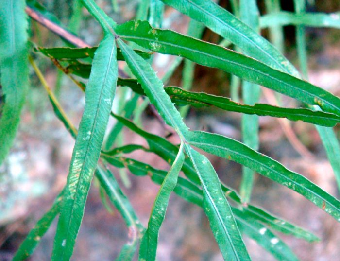 roślina tworzy wysoki i rozłożysty wzrost. Waji o długości 70-100 cm mają opadający kształt. Pierzaste, rozcięte długie liście są ułożone naprzemiennie i pomalowane na ciemnozielony kolor.