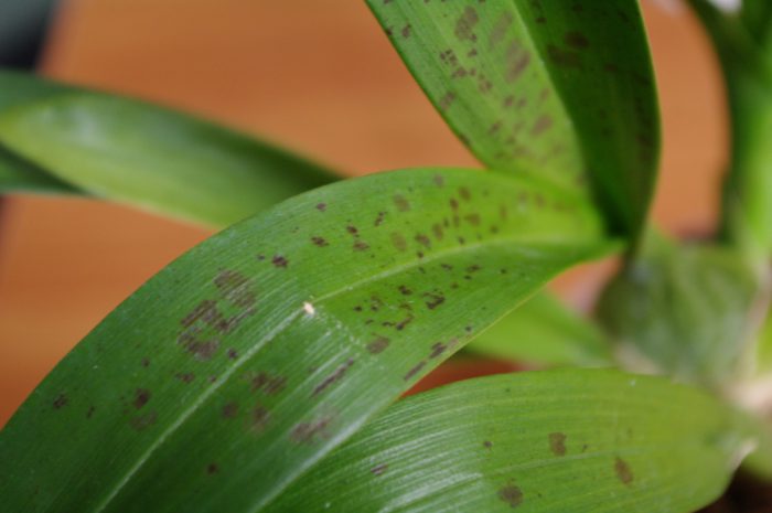 również na powierzchni liści bardzo często pojawiają się małe czarne kropki. Faktem jest, że wszystkie grupy hybryd Oncidium są podatne na choroby grzybowe. Jednocześnie bardzo często zainfekowane okazy są oferowane w kwiaciarniach. Nie można wyleczyć cambrii z tej choroby, ale nie wpływa ona na wzrost i rozwój kwiatu.