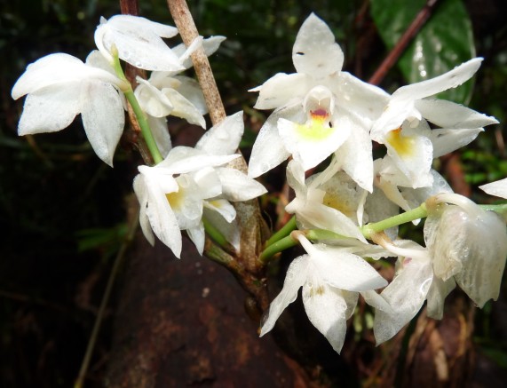 taka Orchidea kwitnie od końca zimy do początku lata. Szypułki powstają u podstawy pseudobulw. Mają łukowaty kształt i osiągają długość 30 centymetrów. Takie szypułki niosą 2-10 zygomorficznych kwiatów. Korona składa się z 2 prawdziwych płatków (petalii) znajdujących się po bokach, 3 działek (sepalii) i wargi (3-o zmodyfikowanym płatku) znajdującej się poniżej. Te kwiaty nie mają zapachu i utrzymują się na roślinie przez stosunkowo krótki czas od 10 do 12 dni.