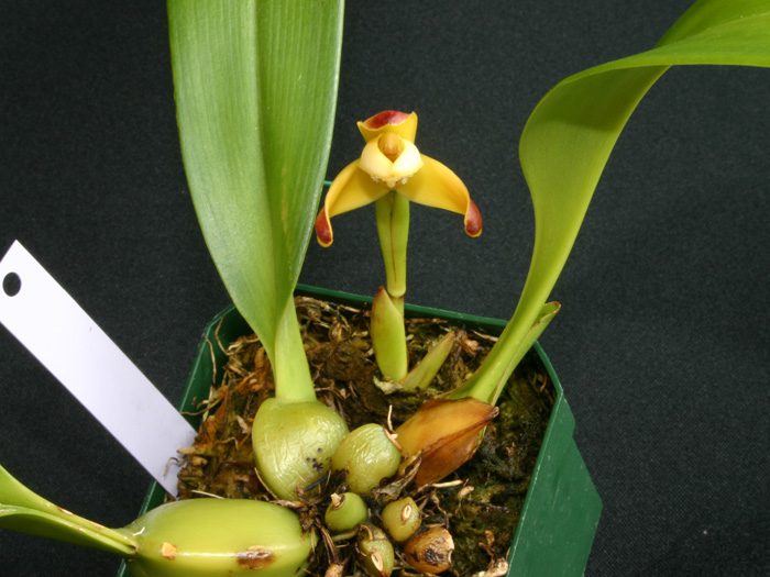 Ta dość zwarta sympodialna orchidea ma nieco spłaszczone, gładkie pseudobulwy o jajowatym kształcie, które osiągają długość 3,5–4 centymetrów i szerokość 2,5–3 centymetrów. Pseudobulwy znajdują się dość blisko siebie na ryzomie (pełzającej, poziomo umieszczonej łodydze naziemnej). Rosną "drabiną", to znaczy każda młoda pseudobulwa zaczyna rosnąć nieco wyżej niż poprzednia, ponieważ ryzom nie jest dociskany do powierzchni gleby, a z czasem stopniowo się unosi. Młode pseudobulwy są jednolistne, podczas gdy stare stają się"łyse". Skórzaste liście w kształcie paska mają spiczasty koniec i wyraźną żyłę środkową, podczas gdy młode są złożone. Osiągają długość 35 centymetrów, a szerokość zaledwie 1 centymetra.