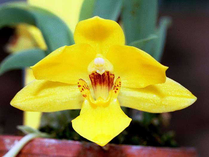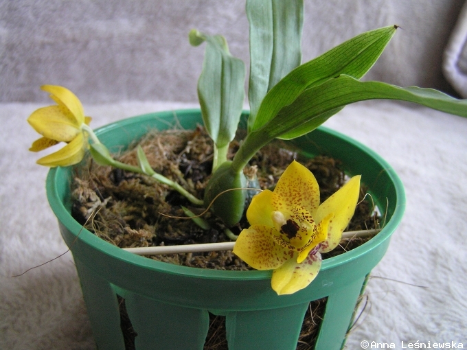 ten gatunek jest najczęstszy u rosyjskich hodowców kwiatów. Czworościenne, owalne pseudobulwy osiągają wysokość 2 centymetrów, a szerokość 1,5 centymetra. Płatki i płatki mają czysto żółty kolor, a na podstawie wargi i powierzchni płatów, a także na wewnętrznej stronie kolumny znajduje się wiele plam w kolorze bordowym.