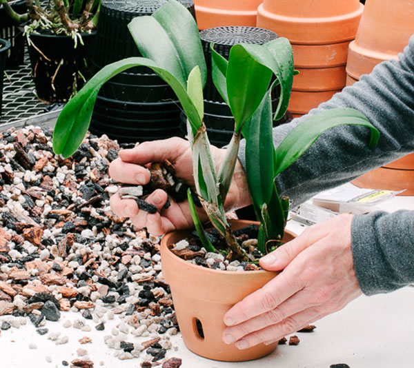 najlepiej przesadzać w czasie, gdy młode pseudobulwy zaczynają mieć własny system korzeniowy.