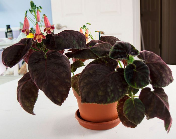 taka roślina jest trawiasta. Ma proste owłosione łodygi, które mogą osiągnąć wysokość 70 centymetrów. Korzenie są łuskowate, podobnie jak achimenes. Pędy są proste. Owłosione brązowo-zielone liście rosną asymetrycznie. Mają kształt owalu lub serca.