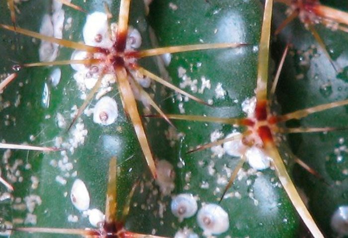 jeśli owady osiadły na roślinie, można to zrozumieć na brązowych płytkach na powierzchni łodygi. Aby upewnić się, że pojawienie się tych płytek jest związane z zajęciem kaktusa przez szkodnika, konieczne jest przykręcenie go ostrym przedmiotem. Jeśli pod płytką zobaczysz całą Nie zgniłą tkankę, oznacza to tarczę. Jeśli jest wiele szkodników, pokryją powierzchnię rośliny lepkimi wydzielinami. Bez pestycydów można sobie poradzić tylko wtedy, gdy na krzaku jest niewiele łusek. Weź wacik, zwilż go alkoholem i wytrzyj do miejsc, w których znajdują się szkodniki. Jeśli takie leczenie nie jest możliwe z powodu kolców lub szkodników jest wiele, wówczas kaktus jest spryskiwany roztworem Confidora lub Aktary.