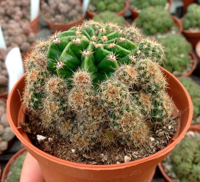 podczas gdy roślina jest młoda, jej łodyga ma kształt kuli, ale po pewnym czasie zmienia się na Cylindryczny. Co więcej, Wysokość łodygi może wynosić około 10 centymetrów, a jej średnica osiągnie 4-6 centymetrów. Na ciemnozielonej łodydze znajduje się 14 lub 15 wysokich wyraźnie widocznych żeber, a na nich powstają otoczki z brązowym pokwitaniem. Z jednej otoczki może wyrosnąć do czterech centralnych kolców o długości około 30 mm i około 10 bocznych igieł o długości około 10 mm.w takiej roślinie powstaje duża liczba pędów podstawowych. W środkowej lub dolnej części łodygi latem pojawiają się kwiaty w kształcie dzwonu, o średnicy dochodzącej do 80 mm. Perianthus są szczeciniaste, rurka jest krótka, a płatki o spiczastych wierzchołkach są pomalowane na pomarańczowo-żółty odcień. Rozcięte owoce mają owalny kształt.