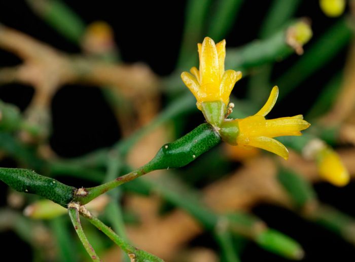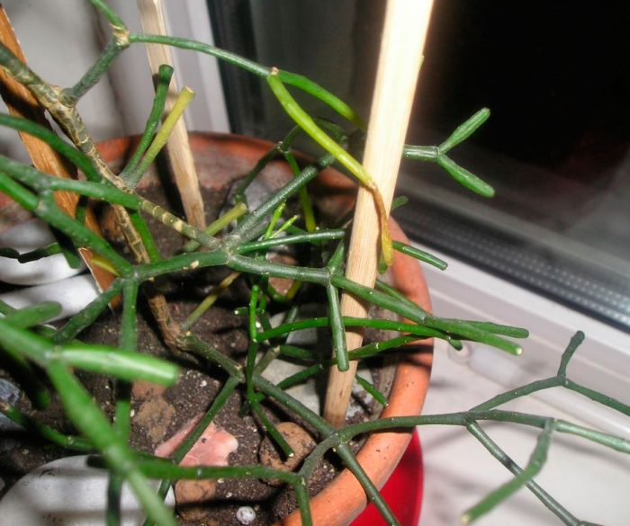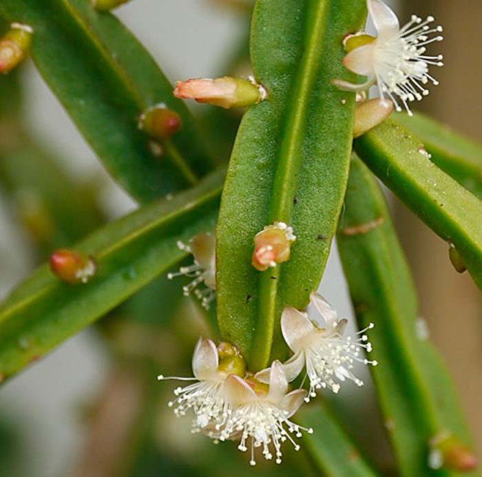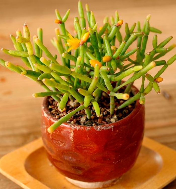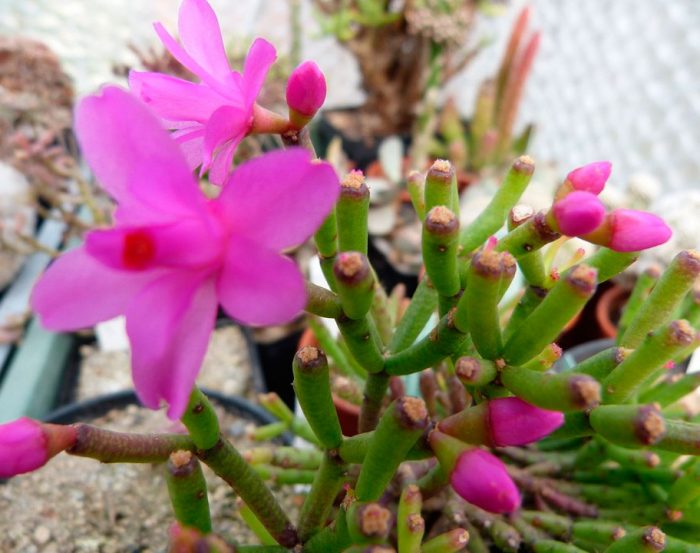 w tej roślinie pędy są łukowate lub proste, osiągają długość około 0,3 m. składają się z ciemnozielonych segmentów cylindrycznych w przekroju, których długość wynosi 20-50 mm, a ich średnica sięga 5 mm. kwiaty są szkarłatne.