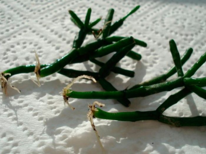 kryty hatiora można bardzo łatwo i szybko rozmnażać przez sadzonki. Każdy fragment oderwany od łodygi może być użyty jako cięcie i może dać korzenie natychmiast w doniczce obok krzewu macierzystego. Aby pomnożyć kwiat w ten sposób, gdy zanika, ostrożnie odkręć 3 lub 4 segmenty od pędu. Powstałe cięcie musi leczyć ranę zmiażdżonym węglem drzewnym i pozostawić do wyschnięcia na wolnym powietrzu przez 3-5 dni. Następnie dolną część segmentu posypuje się Kornevin i sadzi do ukorzenienia w wilgotnej mieszance gleby. Podlewanie sadzonek odbywa się tylko wtedy, gdy mieszanina gleby całkowicie wyschnie, podczas gdy jest zwilżana przez tacę ociekową (dolne podlewanie). Jeśli młoda roślina jest odpowiednio pielęgnowana, to w przyszłym roku zakwitnie.