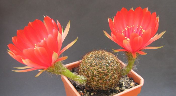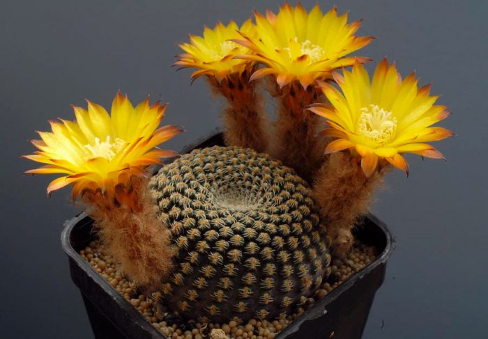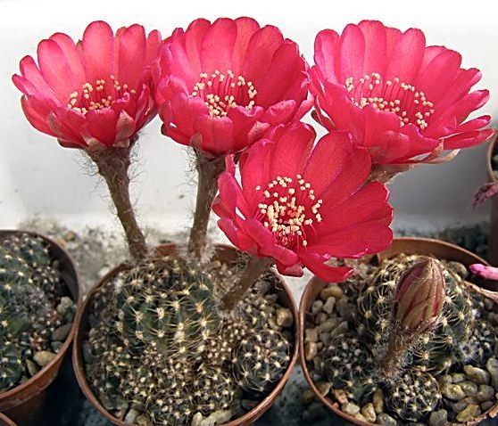 ta roślina Na zewnątrz jest "klasycznym" kaktusem. Młoda roślina ma symetryczną łodygę w kształcie kuli. Z czasem staje się Cylindryczny. Łodyga kaktusa jest słabo rozgałęziona, ale z czasem tworzy wiele podstawowych dzieci. Dzięki tej funkcji 1 Kaktus rosnący w naturalnych warunkach może tworzyć dość duże formacje przypominające poduszkę-kolonie. Żebra tych roślin są w różnym stopniu okrągłe lub ostre. Na małych guzkach żebrowych znajdują się otoczki, z których wychodzą kępki dość sztywnych kolców. Oddzielne pojedyncze kwiaty mają kształt lejka i tworzą się w otoczkach na szczycie łodygi (z boku). Z reguły szypułki mają dość gęste pokwitanie, ale czasami są pokryte kolcami. Rura Corolla jest dość długa (około 30 centymetrów), a średnica otwarcia wynosi 15 centymetrów. Kwiaty mogą mieć różne kolory, jest nawet wielokolorowy. Około 25 kwiatów może otworzyć się w tym samym czasie na DOROSŁYM kaktusie, a każdy z nich może trwać od 1 do 3 dni.