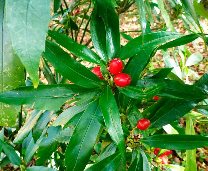 taki zimozielony krzew ma zdrewniałe łodygi pomalowane na Zielono. Skórzaste w dotyku przeciwległe błyszczące płytki liściowe nie mają przylistków, ich krawędź jest ząbkowana, osiągają około 6 centymetrów szerokości i do 20 centymetrów długości. Kształt liści jest wydłużony-owalny i jest pomalowany na zielono, a czasem jest na nim wzór. Kwiaty są tej samej płci i małe, są pomalowane na różne odcienie czerwieni. Są częścią kwiatostanu w kształcie wiechy. Owocem jest czerwona lub pomarańczowa jagoda.