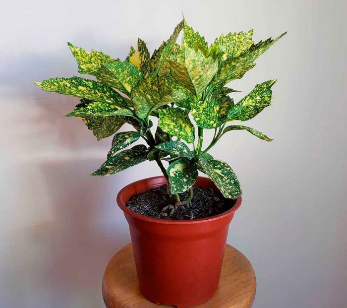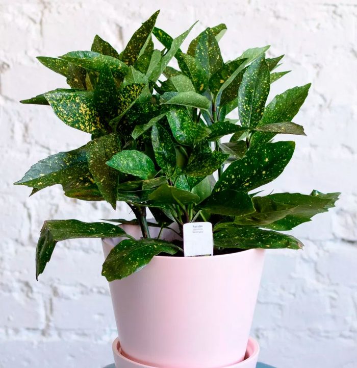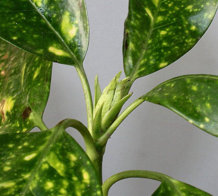 - Kwitnienie . Uprawiana w domu aukuba kwitnie rzadko. Czasami jednak w najkorzystniejszych warunkach na krzaku w lutym–kwietniu powstają kwiatostany, które nie mają szczególnej wartości dekoracyjnej.