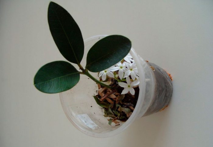 ukorzenianie sadzonek trwa bardzo długo i rzadko się udaje. Faktem jest, że w nich znajduje się mleczny sok. Górne części pędów z 2-3 węzłami są cięte na sadzonki. W dolnej części wszystkie liście należy odciąć, aw górnej części skrócić o ½ części. Następnie cięcie należy obniżyć do pojemnika wypełnionego ciepłą wodą. W takim przypadku tylko dolna część powinna być zanurzona w cieczy. Jest to konieczne, aby wyciekła większość mlecznego soku. Następnie dolna część jest lekko przycięta, a cięcie zanurza się w roztworze substancji stymulującej wzrost korzeni przez 24 godziny. Następnie przygotowane sadzonki sadzi się w podłożu złożonym z torfowca i piasku. Aby pomyślnie ukorzenić, potrzebujesz mini-szklarni z dolnym ogrzewaniem,ponieważ temperatura musi stale utrzymywać się na poziomie 25 stopni. Dopóki nie pojawią się korzenie, podlewanie praktycznie nie jest wykonywane, ale konieczne jest regularne spryskiwanie liści. Po ukorzenieniu rośliny przesadza się do doniczki z luźną, wzbogaconą w składniki odżywcze glebą. W tym samym czasie rozpoczyna się formowanie korony. Najpierw musisz uszczypnąć wierzchołkowe pąki w szybko rosnących łodygach, a następnie usunąć niepotrzebne pędy.