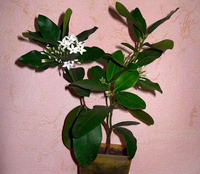 bardzo pachnące kwiaty (zapach podobny do jaśminu) mają śnieżnobiały kolor. Powstałe owoce mają podobny kształt do oliwek. Ich kolor zmienia się z jasnoróżowego na niebiesko-czarny w miarę dojrzewania.