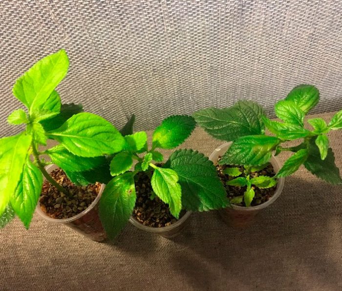 ciemnozielone liście na łodydze znajdują się naprzeciwko i mają ząbkowane krawędzie. Poniżej liście wzdłuż żył są owłosione. Pocierając lekko liść, możesz poczuć ostry i bardzo przyjemny zapach, który jest w stanie wypełnić cały pokój.