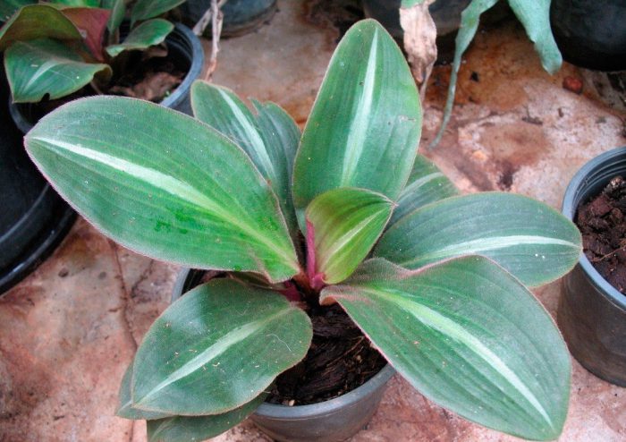 ta wieloletnia roślina zielna może osiągnąć wysokość 30-40 centymetrów. Ma bardzo krótką łodygę i ma gęstą rozetę liści. Liście są dość duże i bardzo mięsiste. Proste liście mają kształt eliptyczny, ich szerokość wynosi około 10 centymetrów, a długość ― 20 centymetrów. Błyszcząca przednia strona liści jest pomalowana na ciemnozielony kolor, a pośrodku znajduje się srebrny, jasnozielony podłużny pasek. Niewłaściwa strona jest pomalowana na zielonkawo-purpurowy kolor.