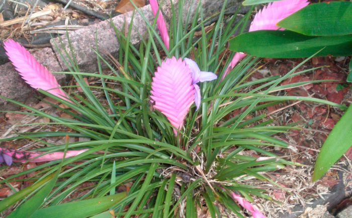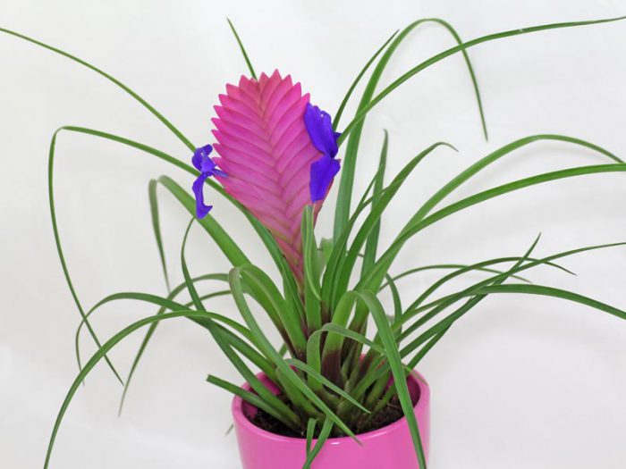 tę roślinę można kupić w prawie każdej kwiaciarni. Zakrzywione, wąskie liście są zebrane w rozetę i osiągają długość 30 centymetrów. U podstawy są pomalowane na brązowo-czerwony kolor. Na powierzchni liścia znajduje się wiele małych łusek, które ściśle przylegają do siebie. Kwitnienie obserwuje się latem. Pojawia się gęsty Kłos o eliptycznym kształcie. Przylistki są pomalowane na liliowy lub różowy kolor, a wzdłuż ich krawędzi kwitną małe kwiaty o niebieskim lub różowym kolorze. Kwitnienie kwiatów następuje stopniowo i zaczyna się od góry.