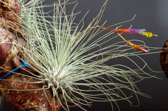 ten epifit może przyczepić się do prawie wszystkiego i rosnąć w różnych miejscach. Zakrzywione, srebrne liście są zebrane w schludne, małe rozety. Liście latem nabierają czerwonawego odcienia. Ma niezbyt duże kwiatostany w kształcie kolca, pomalowane na fioletowo-niebieski kolor.