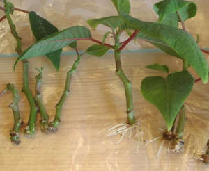 do ukorzeniania zwykle stosuje się zwilżoną luźną glebę lub wodę. Dozwolone jest ukorzenienie w mieszance gleby, zarówno do przesadzania, jak i mieszania piasku z torfem w równych proporcjach. Aby poinsecja zakorzeniła się szybciej, zaleca się stosowanie stymulatora wzrostu (na przykład Heteroauxin). Umieścić w cieple(24-28 stopni). Konieczne jest regularne wietrzenie i spryskiwanie. Kiedy pojawią się korzenie (po 4 tygodniach), młode kwiaty należy sadzić w osobnych niezbyt dużych pojemnikach. Ukorzeniona łodyga musi zostać przycięta, aby roślina była bardziej rozgałęziona.