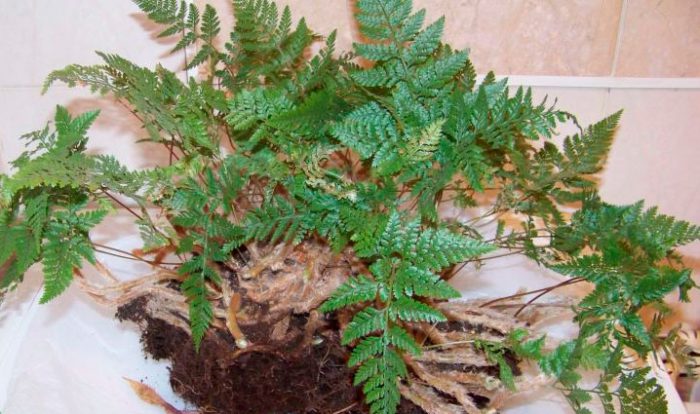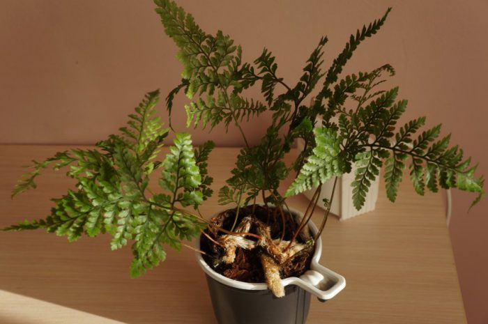 w warunkach pokojowych taka paproć jest często uprawiana w wiszącym koszu. Connie zwisają swobodnie Na Zewnątrz doniczki, a na górze są pokryte gęstymi liśćmi.