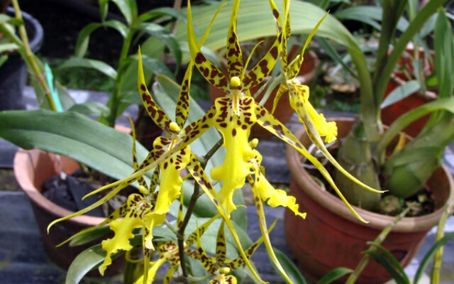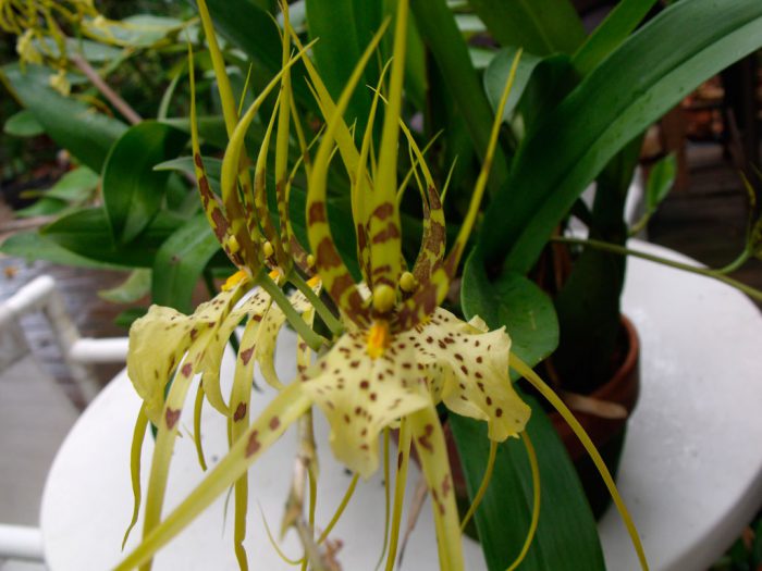 ta Orchidea różni się od innych tym, że ma niezwykle niezwykłe kwiaty, z powodu których jest również nazywana "orchideą pająka". Są pomalowane na Żółto w różnych odcieniach, a na ich powierzchni znajdują się wypukłe brązowawe plamki. Można również znaleźć gatunki o prawie brązowych kwiatach z zielono-żółtymi plamami. Działki osiągające długość 15 centymetrów mają wydłużony kształt. Z reguły w kwiatostanie jest od 6 do 8 kwiatów, aw niektórych przypadkach więcej. Zewnętrznie ten kwiatostan jest bardzo podobny do owada stonogi.
