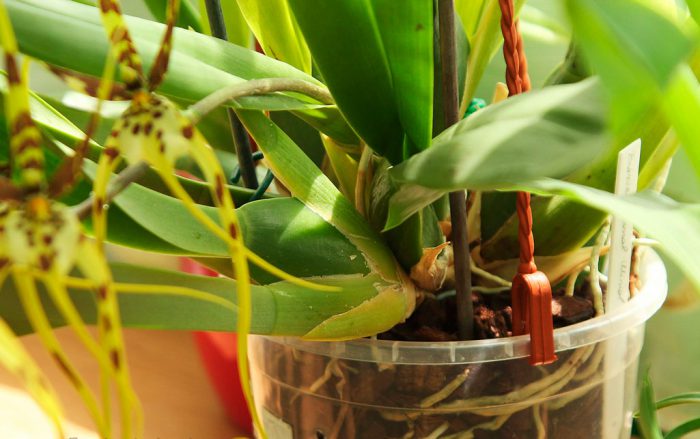 w cieplejszych miesiącach zaleca się podlewanie rośliny, zanurzając doniczkę w wiadrze wypełnionym wodą (przytrzymaj przez 20 do 30 minut). Gdy garnek zostanie wyciągnięty, musisz poczekać, aż nadmiar płynu spłynie. Zimą podlewanie jest rzadsze, ale upewnij się, że pseudobulwy nie są pomarszczone.