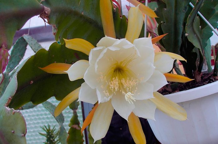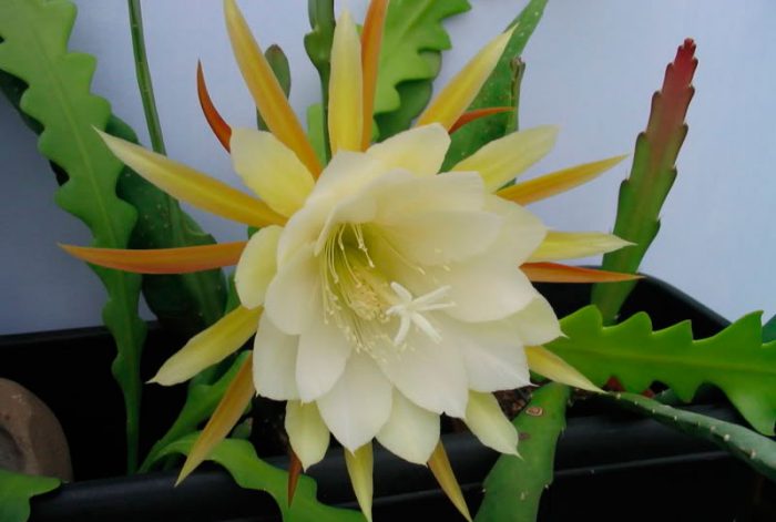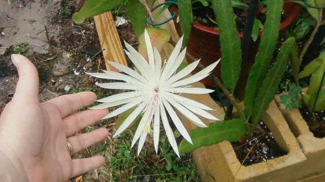 ten kwiat może osiągnąć wysokość 300 centymetrów. Jego łodygi w kształcie pręta są bardzo długie, a od dołu są zdrewniałe. Dość szerokie (do 10 centymetrów) płaskie łodygi mają krawędzie o dużych rozmiarach. Białe kwiaty są bardzo pachnące i osiągają długość 20 centymetrów. A także mają rurkę, na której powierzchni znajdują się rozproszone łuski. W tym kwiacie owoce są pomalowane na Czerwono. Istnieje również wiele hybryd, które różnią się kolorem kwiatów i rozmiarem.