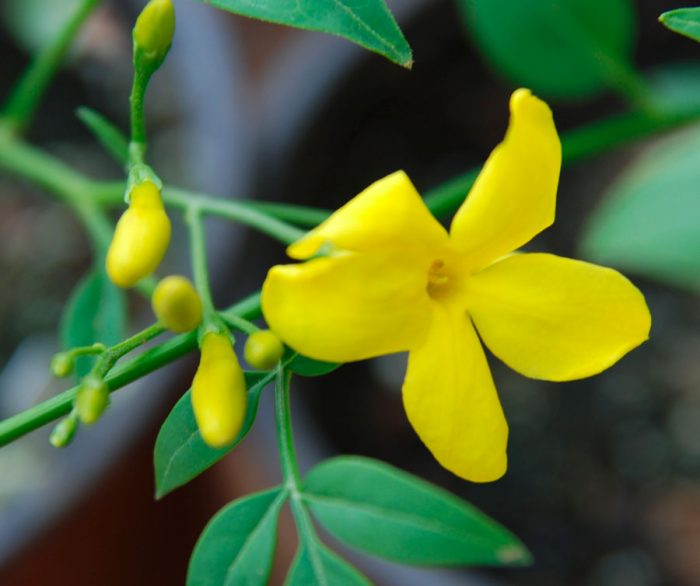 ten gatunek jest reprezentowany przez słabo rozgałęzione krzewy. Na długich opadających pędach znajduje się niewielka ilość liści. Niezbyt duże potrójne płytki liściowe mają bogaty zielony kolor. Zimą część liści leci z krzaka. Gatunek ten nazywany jest również "zimowym jaśminem", wynika to z faktu, że kwitnie w środku zimy, a krzew kwitnie w połowie wiosny. Duże kwiaty rosną wzdłuż całej łodygi z zatok liściowych, ich kolor jest podobny do żółtka jaja.