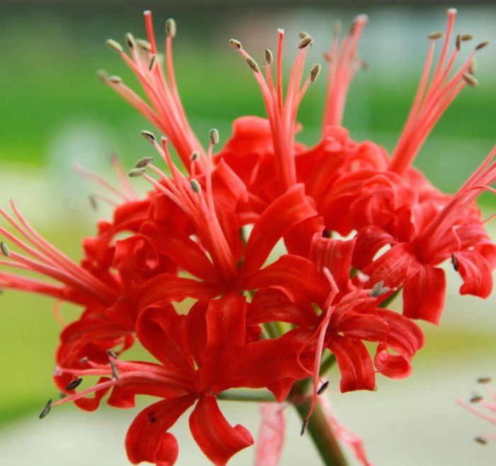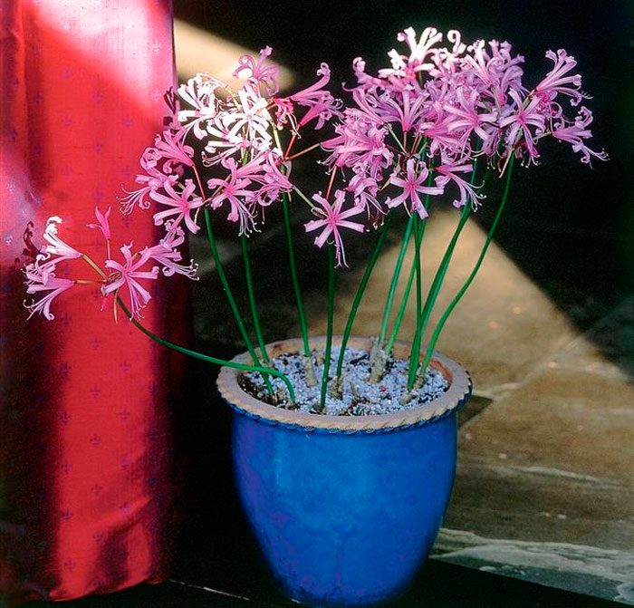 bulwiasta roślina Nerine (Nerine) jest przedstawicielem rodziny Amarylisaceae. Rodzaj ten łączy około 30 różnych gatunków. Ta bulwiasta wieloletnia roślina ozdobna występuje naturalnie w południowej Afryce, a także w jej tropikalnych pasach. W regionach o chłodnym klimacie taka kultura jest uprawiana na tarasach lub w warunkach pokojowych. A na obszarach o stosunkowo ciepłym klimacie jest uprawiany na otwartym terenie przez cały rok. Taka roślina kwitnie w pierwszej połowie okresu jesiennego. Szypułka z kwiatostanami i liśćmi rosną jednocześnie. Długość szypułki wynosi około 50 cm. Ciemnozielone płytki liściowe są wąskie i długie. Kwiaty w kształcie lejka są zbierane po kilka sztuk w parasole. Kolor kwiatów jest biały, różowy, czerwony lub pomarańczowy.