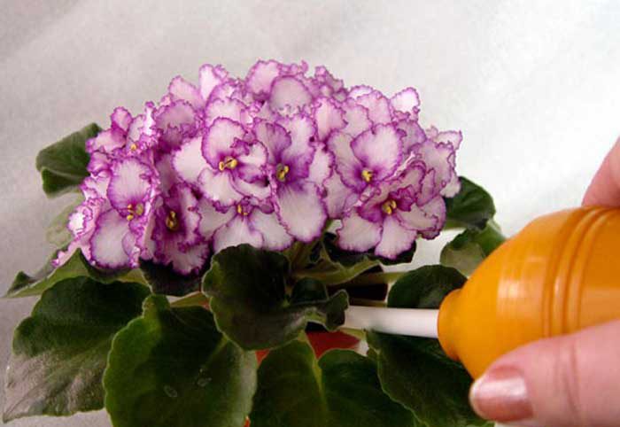 Saintpaulia uwielbia wysoką wilgotność powietrza, ale czuje się dobrze w suchym powietrzu. Nie zaleca się spryskiwania fiołka, ale należy podjąć inne środki w celu zwiększenia wilgotności.