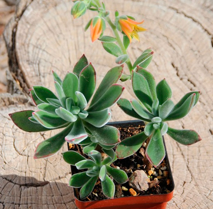 ten soczysty krzew rozgałęzia się bardzo słabo, jego ojczyzną jest Meksyk. W obszarze blizny liściowej korzenie powietrzne tworzą się na pędzie takiej rośliny. Podłużne rombowe płytki liściowe są zebrane w rozety, ich długość wynosi 20-40 mm, a szerokość 15 mm.na powierzchni liści występuje delikatne pokwitanie, a górna krawędź ma czerwone obramowanie. Długość kwiatów wynosi około 30 mm, są czerwone, a krawędź płatków jest żółta.