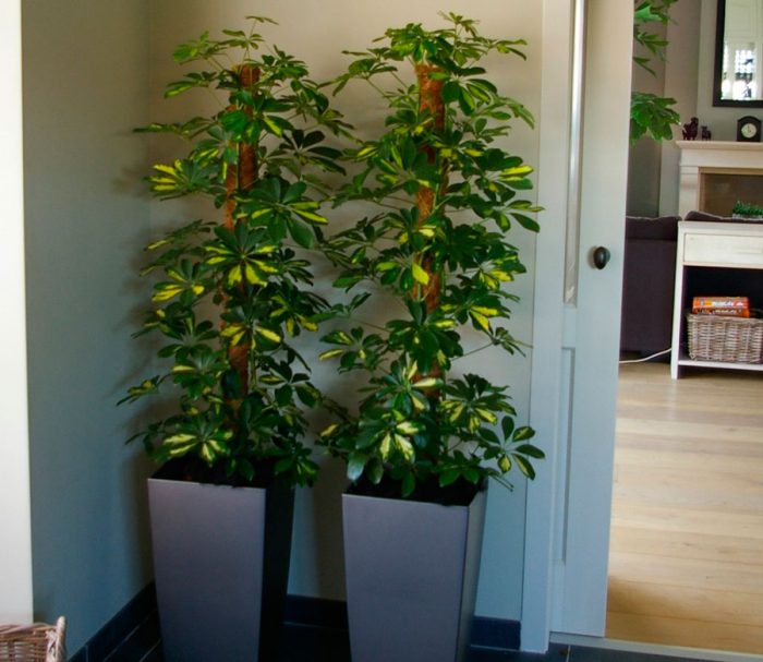 wysokie pędy takiej rośliny nie mają dużej grubości, dlatego często kilka młodych Scheffler sadzi się jednocześnie w jednej doniczce. A z nich powstaje wspólna łodyga (spleciona). Jeśli tylko jeden wysoki kwiat zostanie posadzony w doniczce, zwykle wykonuje się dla niego wsparcie.