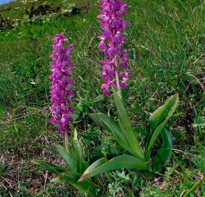 na wierzchołkach liściastych łodyg znajdują się szypułki, na których powstają kwiatostany w kształcie kolca. W wysoce dekoracyjnych kwiatach warga jest trójłopatowa, a ostroga stożkowata. Mają dość niezwykły kolor: biały, jasnofioletowy lub jasny fiolet z małymi plamami o ciemnym odcieniu. Często płytki liściowe takiej rośliny zdobią niezwykły wzór. Początek kwitnienia przypada na połowę-koniec maja. Jego czas trwania zależy od warunków wzrostu rośliny i może wynosić 15-30 dni.