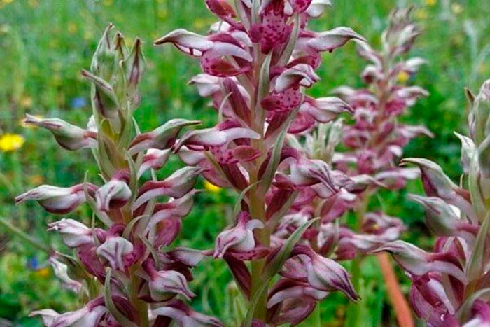 ta roślina jest podgatunkiem Spitzela (Orchis spitzelii). Krzew osiąga wysokość około 0,3 m, jego szerokie płytki liściowe są pomalowane na odcień bagienny. Wąskie wydłużone kwiatostany w kształcie kolca składają się z fioletowych kwiatów z prozielonymi kwiatami, które mają dużą wargę i spektakularny hełm. Obejmuje to również zielonkawo-żółty Jatryszek (Orchis chlorotica lub Anacamptis collina), który jest bratem Zielono-brązowego Jatryszka, ich kwiatostany są jasnożółte.