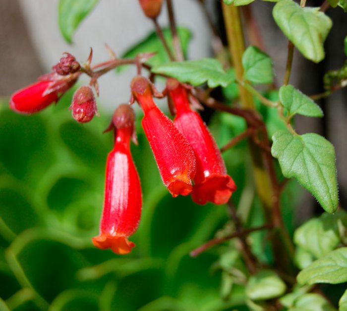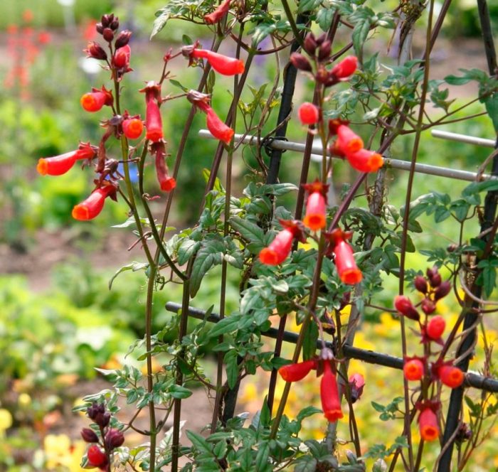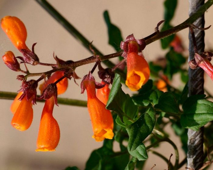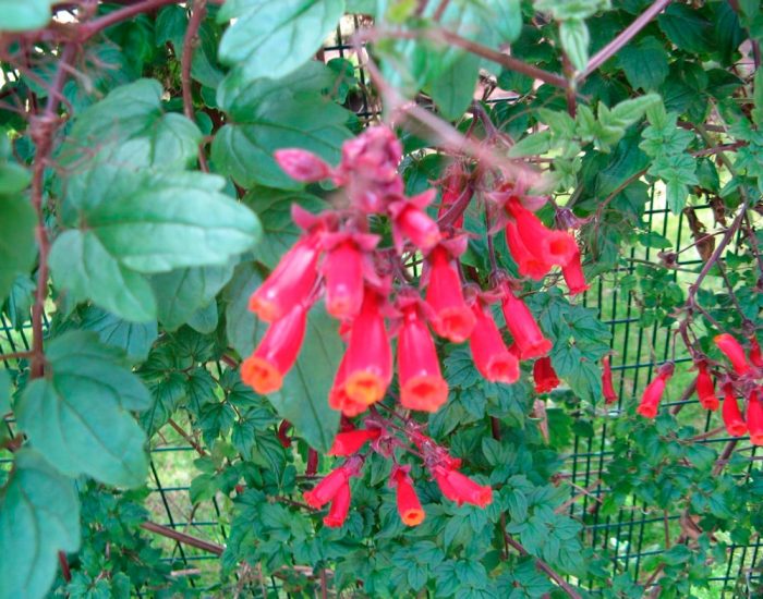 oprócz spektakularnych i niezbyt zwykłych liści, ta liana wyróżnia się bardzo pięknymi kwiatami, które tworzą ogromną liczbę. Podczas kwitnienia na wierzchołkach gałęzi powstają luźne kwiatostany racemose, które składają się z rurkowych małych kwiatów. Mają ognisty kolor. Kwiaty są przeciwnie rozmieszczone w stosunku do liści, dlatego wyraźnie wyróżniają się na tle. Ich gardło jest prawie zamknięte, a rura jest wąska. Z daleka może się wydawać, że kwiaty są rozpryskami jasnej farby na zielonym tle. Kiedy roślina zanika, w miejscu kwiatów powstają jasnozielone owoce, podobne do małych papryki lub włóczni. Początek ich dojrzewania przypada na Sierpień. Pamiętaj, że owoce powstające w miejscu kwiatostanów negatywnie wpływają na blask kwitnienia.