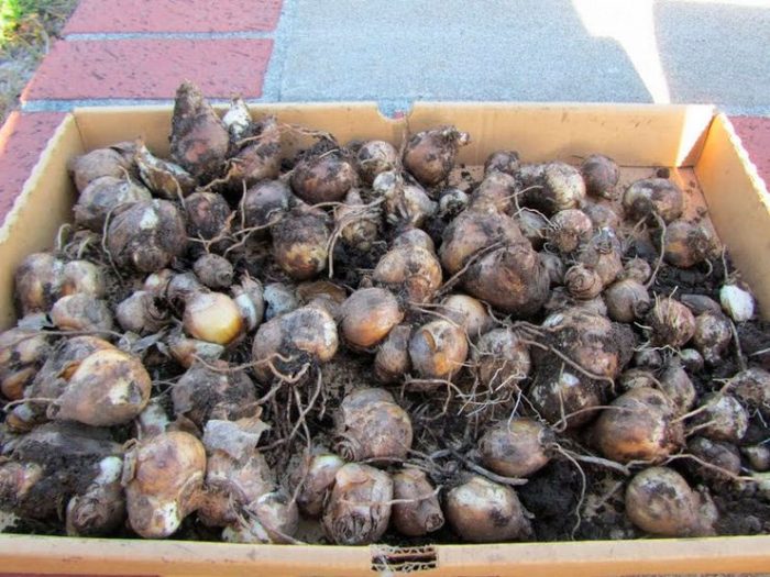 spróbuj wykopać krzaki, zanim ich liście umrą i znikną, ponieważ w tym przypadku bardzo trudno jest znaleźć dokładne miejsce znalezienia cebul. Aby usunąć krzewy z ziemi, użyj łopaty, ponieważ żarówki są dość głębokie. Wyekstrahowane żarówki będą wymagały płukania pod bieżącą wodą i półgodzinnego wytrawiania w roztworze karbofosu (3-4%), zamiast tego mogą być przechowywane przez 10 minut w bardzo ciepłej wodzie (około 50 stopni). Następnie umieszcza się je w zacienionym, dobrze wentylowanym miejscu do wyschnięcia na 7 dni, Temperatura powietrza powinna wynosić około 20 stopni.