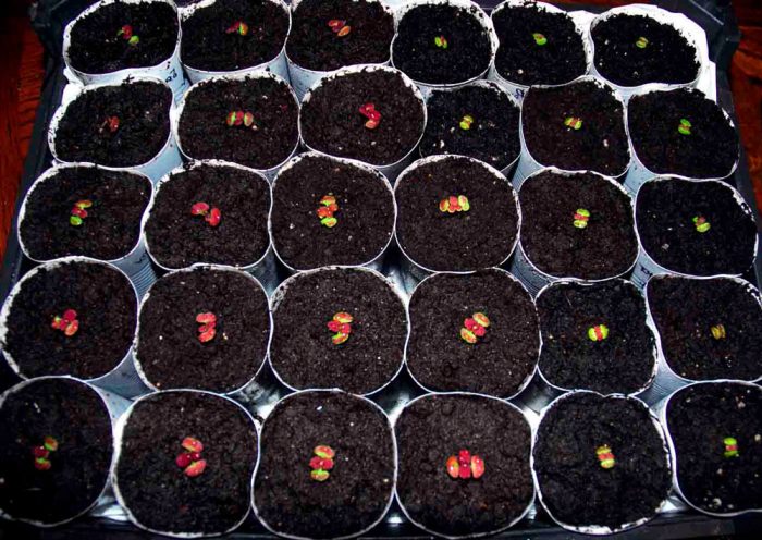 zaleca się wysiew nasion w ostatnich dniach marca. Możesz wysiewać nasiona wcześniej i później, ale w tym przypadku w zimnych porach roku sadzonki będą potrzebować obowiązkowego dodatkowego oświetlenia. Do siewu idealny jest niski pojemnik, który jest wypełniony lekką mieszanką gleby nasyconą składnikami odżywczymi. Równomiernie rozprowadź nasiona na powierzchni mieszaniny gruntów i zwilż uprawy z opryskiwacza, nie trzeba ich uszczelniać w podłożu. Wypełnij nasiona cienką warstwą piasku i przykryj pudełko szkłem (folią). Przenieś uprawy do mrocznego i ciepłego miejsca, upewnij się, że powierzchnia podłoża w pudełku jest trochę wilgotna przez cały czas. Dobry zakupiony materiał siewny charakteryzuje się wysokim kiełkowaniem, czasami kiełek pojawia się z każdego materiału siewnego.