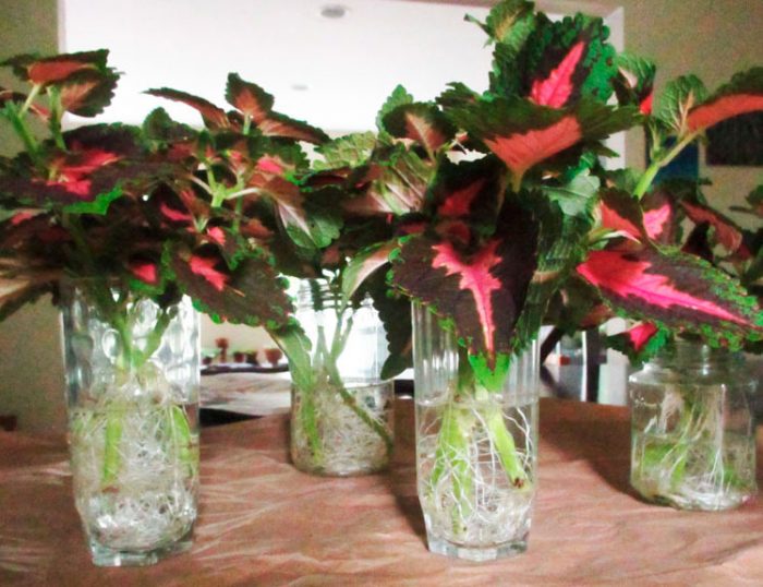 podczas przycinania dorosłego krzewu Pozostałe ścinki nie mogą być wyrzucane, ale używane jako sadzonki. Długość cięcia powinna wynosić około 10 centymetrów, oderwij wszystkie płytki liści od spodu. Następnie do ukorzenienia sadzi się go w zwilżonym piasku lub podłożu, na wierzchu segmentów należy przykryć ciętą plastikową butelką lub przezroczystą torbą. Umieść je w zacienionym miejscu i zapewnij chłód (od 18 do 20 stopni). Ukorzenienie trwa 1-1, 5 tygodnia, po czym sadzonki, które dały korzenie, można sadzić w stałym miejscu. W ten sposób rozmnażanie coleusa jest bardzo proste.