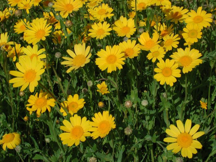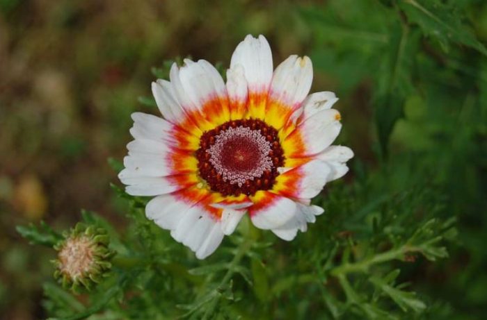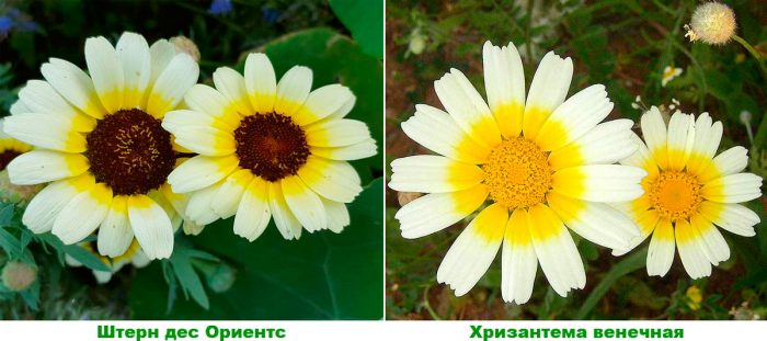 - chryzantema wieńcowa . Wysokość łodyg waha się od 0,4 do 1 metra, są gęsto pokryte pierzastymi oddzielnymi płytkami liściowymi, a na krzaku znajdują się lancetowate, ząbkowane liście. Kwiatostany osiągają około 30 mm średnicy, kwiaty trzciny mogą być kolorowe w różnych odcieniach od białego do żółtego, a rurkowe―zielonkawo-żółte.