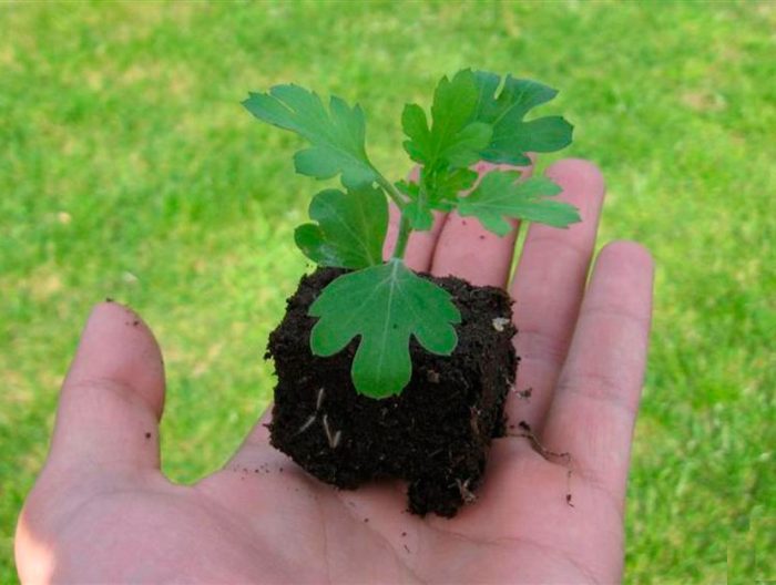 zaleca się sadzenie sadzonek chryzantemy w ogrodzie w deszczowy lub pochmurny dzień. Wygodniej jest sadzić krzewy w wykopie, a nie w dołach do sadzenia, podczas gdy między nimi należy pozostawić odległość od 0,3 do 0,5 m (w zależności od gatunku i odmiany). Aby sadzone sadzonki szybciej się ukorzeniły, są one rozlewane roztworem Kornevina (1 gram na 1 litr wody). Kiedy roślina jest sadzona i podlewana, są szczypane, w tym celu punkt wzrostu jest usuwany. Następnie zaleca się pokrycie sadzonek dowolnym materiałem pokrywającym, na przykład lutrasilem. Stworzy to korzystny mikroklimat, którego sadzonki potrzebują do normalnego ukorzenienia i wzrostu. Po tym, jak chryzantema zapuści korzenie i zacznie rosnąć, schronienie jest usuwane.